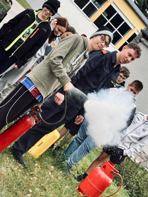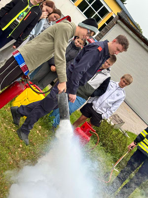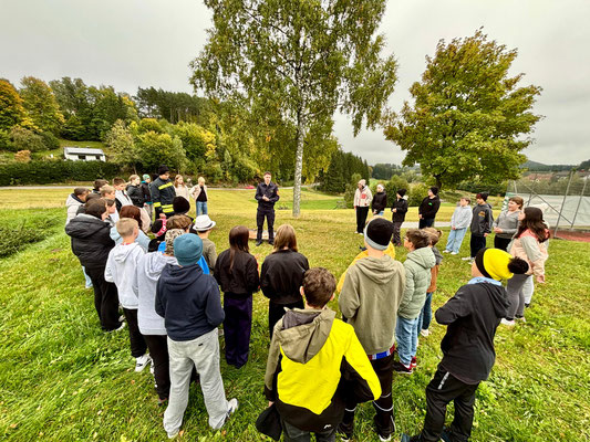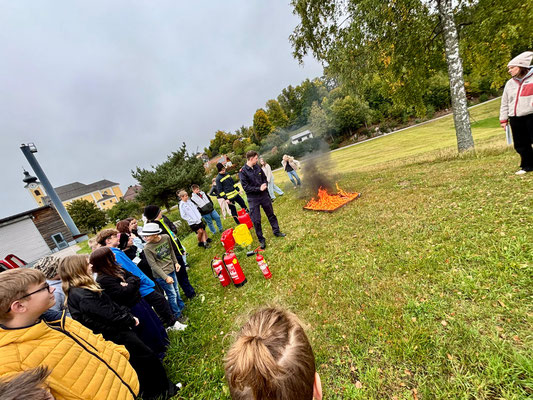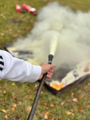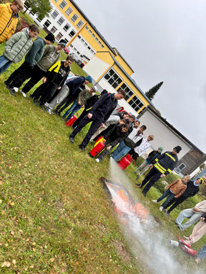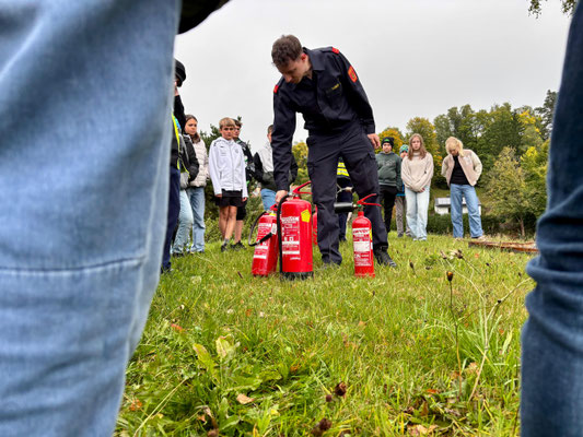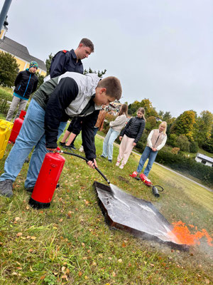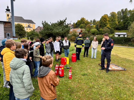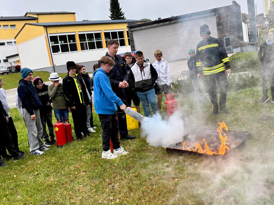 Im Anschluss an den Übungsablauf konnten die Schülerinnen und Schüler der 3. und 4. Schulstufe selbst aktiv werden: Unter Anleitung der Kameraden der Feuerwehr Arbesbach durften sie Feuerlöscher ausprobieren und ein echtes Feuer löschen. Die richtige Handhabung der Geräte wurde zuvor von den Feuerwehrmitgliedern erklärt und vorgezeigt.